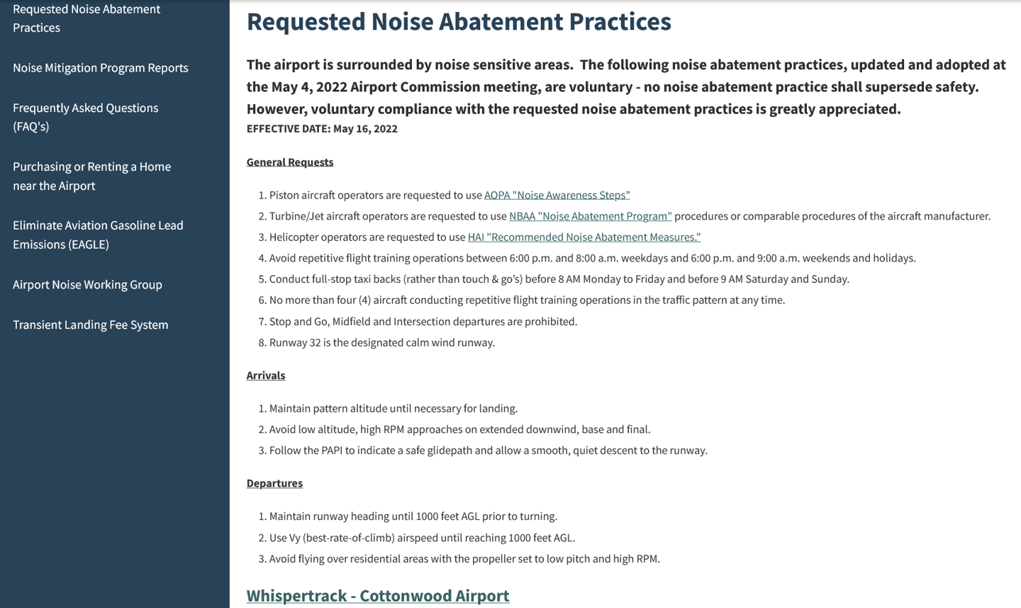 These posted practices are requested, voluntary practices, and not enforceable. They include requests to avoid training activities before 8am and after 6pm M-F, and before 9am on weekends and holidays. Also included in the list of requested practices is to limit the number of planes in the pattern to 4 at a time, and for departing planes to take off to the north.
