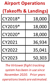 In 2023, there were a total of 50,030 flight operations (takeoffs or landings), the approximate equivalent of 25,015 landings. Here's a breakdown of the landings:
