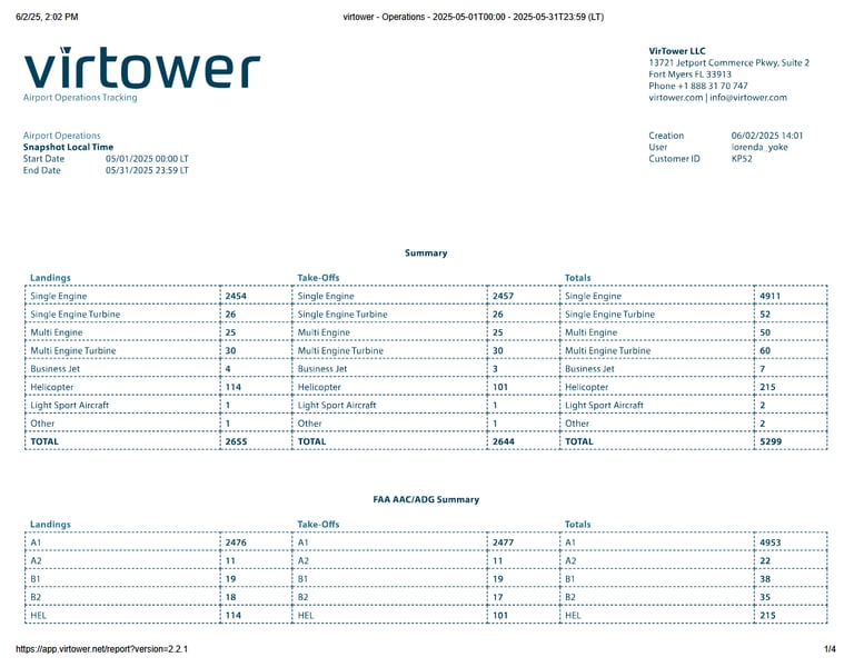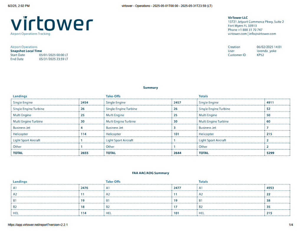 The Cottonwood Airport had a Virtower flight tracking system installed in 2020, and in use in November. Prior to that, the actual number of flight activity was estimated for each year. The estimated activity for 2018 was 18,000. The actual flight activity in 2024 was 56,662. Through May of 2025, the actual flight activity is 30,174, which projects a total 72,417 for the year 2025.