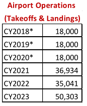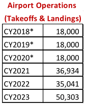 In 2023, there were a total of 50,030 flight operations (takeoffs or landings), the approximate equivalent of 25,015 landings. Here's a breakdown of the landings: